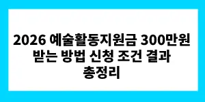 2026 예술활동지원금 300만원 받는 방법 신청 조건 결과 총정리해서 알려 드리겠습니다. 예술인이라면 놓치면 안 되는 지원금이 있습니다. 2026년 예술활동준비금은 문화체육관광부와 한국예술인복지재단이 함께 운영하는 사업으로, 선정되면 1인당 300만 원을 지급받습니다. 올해 …